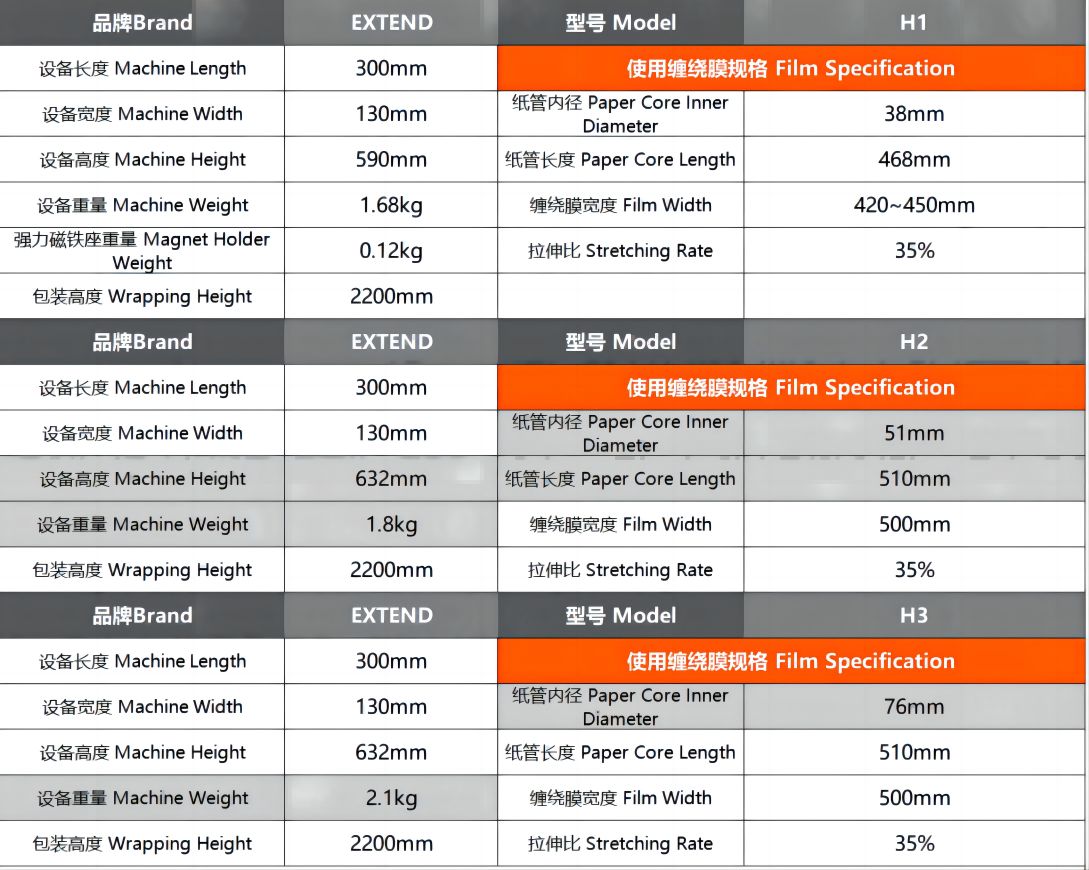 小黃蜂EXTEND手持式纏繞器,包含三種規(guī)格,針對于市面上不同的手工膜都能很好地適用。