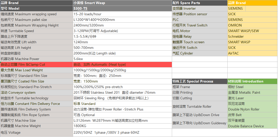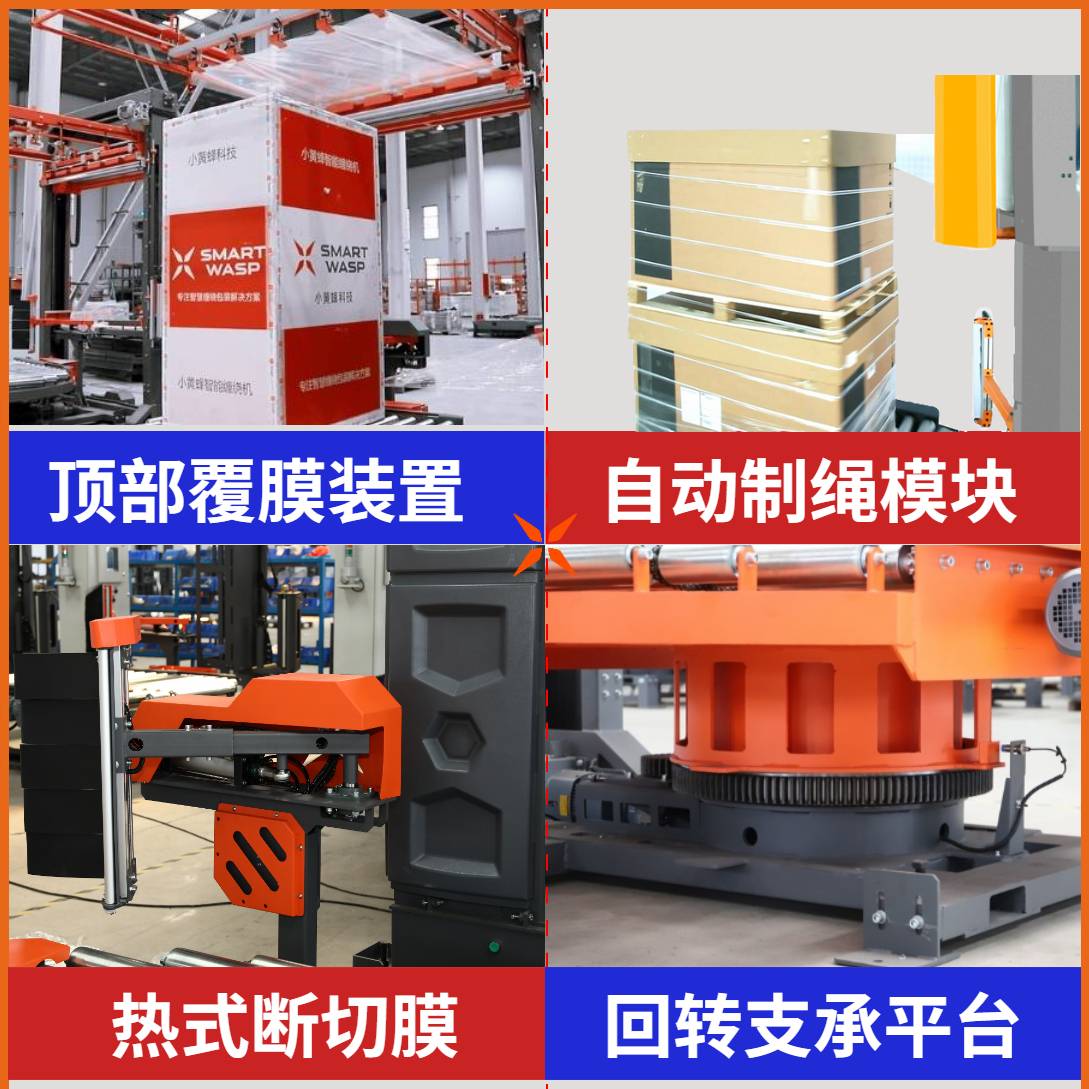 小黃蜂在線纏繞覆頂一體機(jī)S300-TS,在原有轉(zhuǎn)臺(tái)式纏繞機(jī)的基礎(chǔ)上,增加了覆頂膜機(jī)構(gòu),