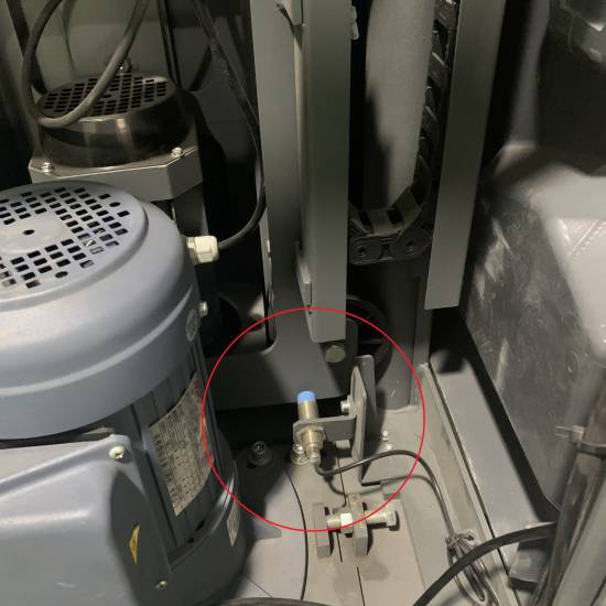 從下面來(lái)看的話,立柱底部有一個(gè)圓柱形接近開關(guān),其作用為控制膜座的下限位,當(dāng)膜座小車下降至下限位被接近開關(guān)感應(yīng)到時(shí),膜座小車就不會(huì)再下降。這個(gè)接近開關(guān)還有另一個(gè)作用即通過(guò)調(diào)節(jié)下限位來(lái)使得纏繞膜的最低點(diǎn)下降,可以把貨物和托盤緊密結(jié)合,貨物更不易從托盤上滑落,當(dāng)此接近開關(guān)損壞,在正常運(yùn)行時(shí),膜座便會(huì)由于感應(yīng)不到下限位而一直下降,直至觸發(fā)防壓開關(guān)才會(huì)停止;此開關(guān)損壞也會(huì)導(dǎo)致部分含自動(dòng)斷切膜裝置的設(shè)備斷切功能受影響。當(dāng)其損壞時(shí),必須第一時(shí)間聯(lián)系售后對(duì)此開關(guān)進(jìn)行更換。